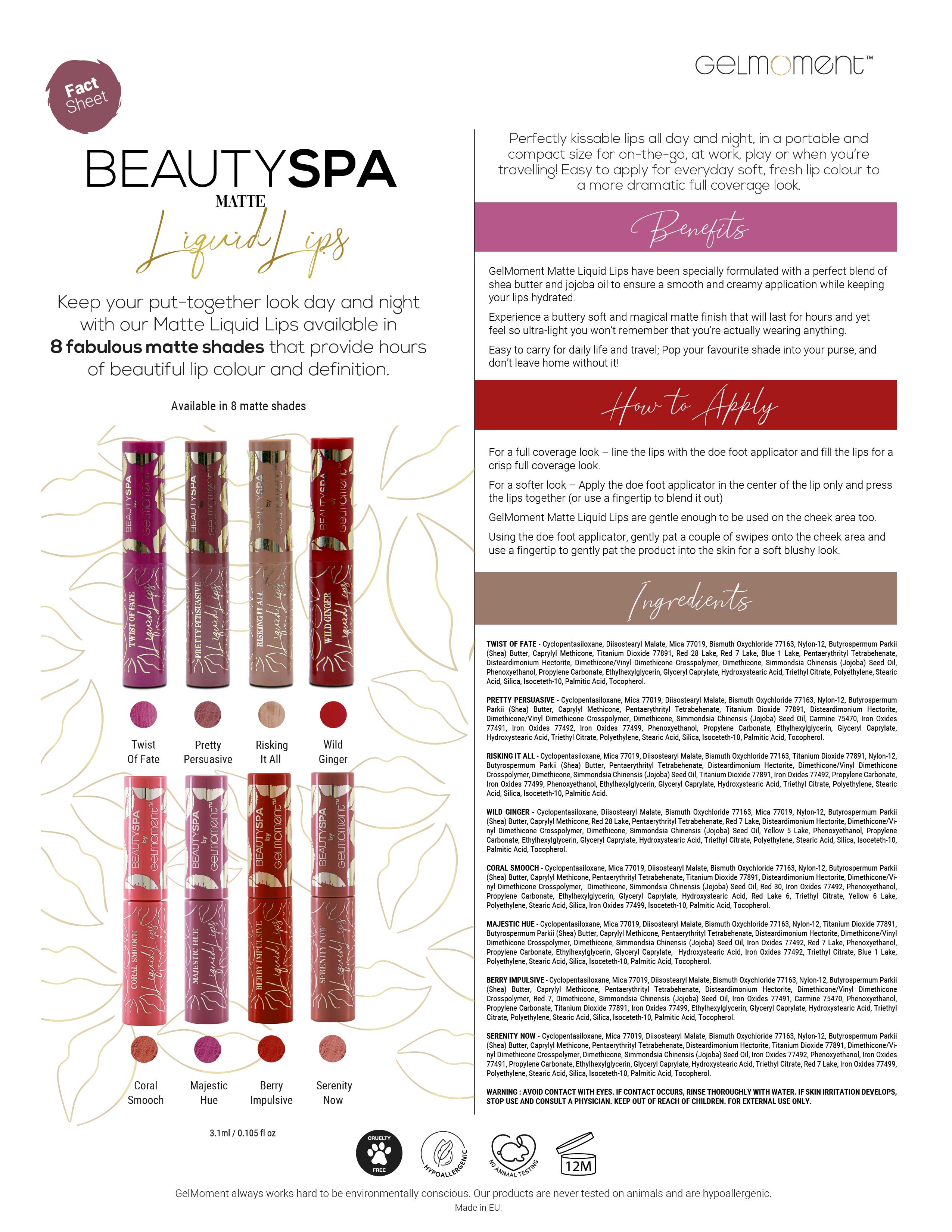GelMoment Matte Liquid Lips have been specially formulated with a perfect blend of shea butter and jojoba oil to ensure a smooth and creamy application while keeping your lips hydrated.