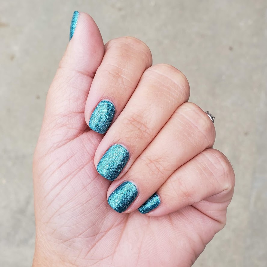 This dark teal polish shimmers like sunlight on rippling water.